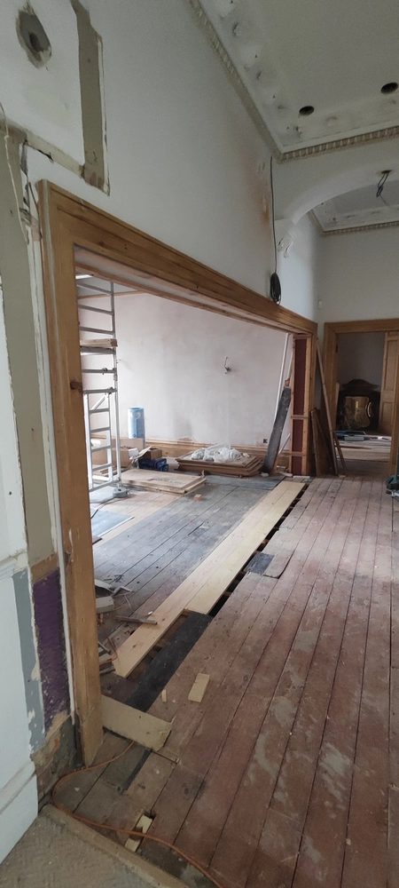 A newly formed arched opening over 3.5 metres high was carefully designed to mirror the home’s original heritage arch and fitted with arched double steel doors. A 6-metre-wide set of slim-profile steel doors with fixed side panels now separates the living room and hallway, flooding both spaces with light while reducing noise from the staircase and keeping the home warm.