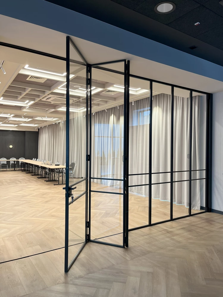 Accordion Bifold black steel doors can consist of two panels up to 14 panels. Our intelligent solution smoothly guides the Bifold steel doors along the track, effortlessly handling the weight of the heavy steel doors. The Bifold steel doors can be closed with a magnet or a traditional lock with a handle. Our Bifold steel doors can be used as interior or exterior doors for a terrace or kitchen extension. Each Bifold steel door is made of 100% steel and comes equipped with steel hinges, steel handles or knobs, and the bars are also made of steel. We use 6mm toughened safety glass in our Bifold steel doors, and upon request, laminated glass is available, which prevents shattered glass from dispersing into small pieces.