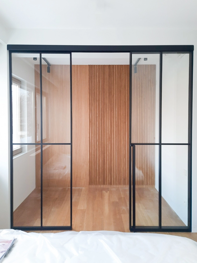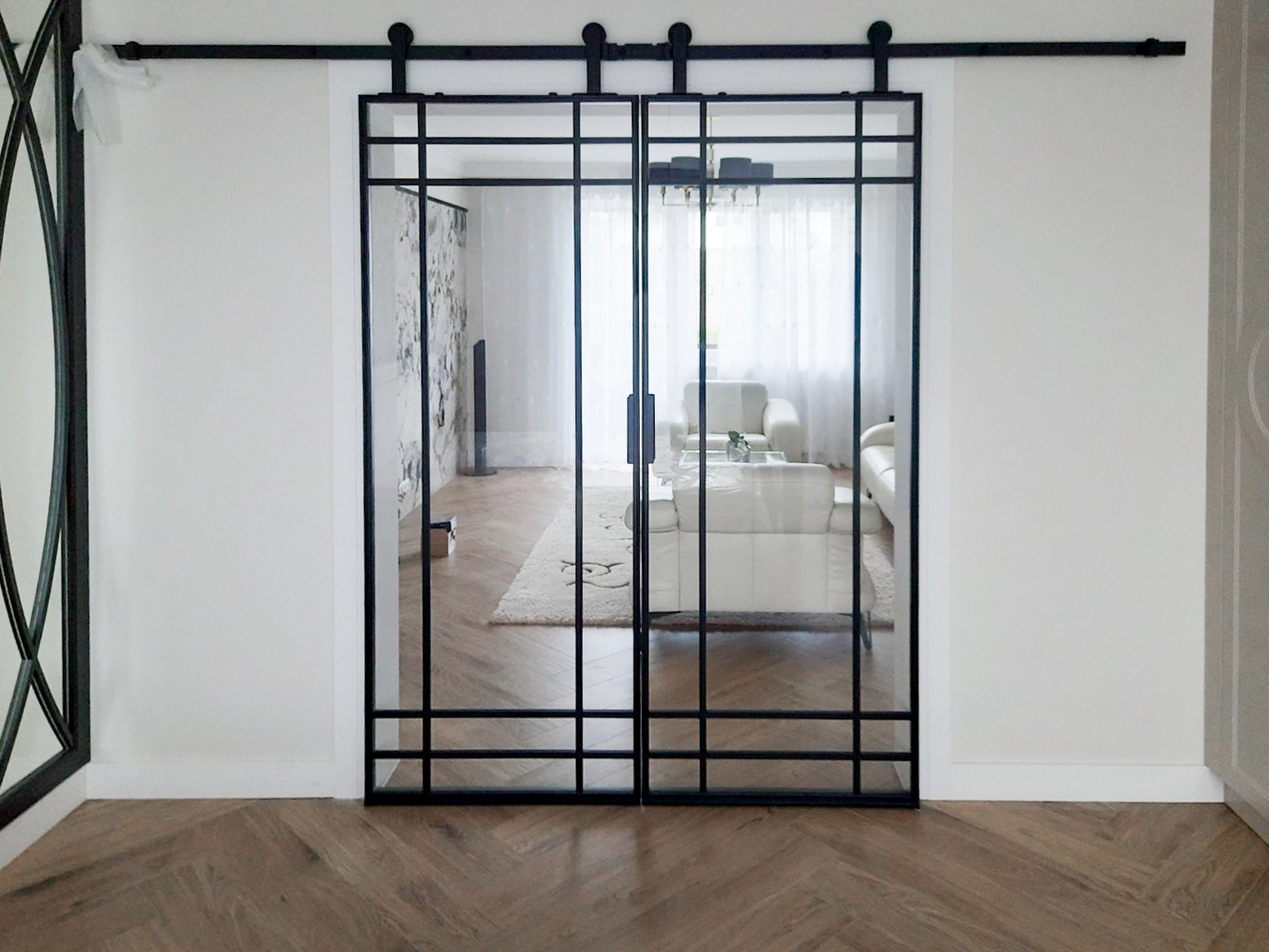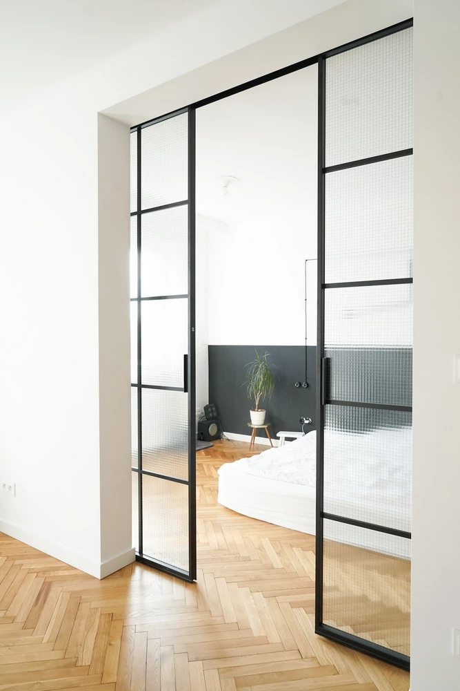 Our double sliding black steel doors do not require a floor track. Thanks to our intelligent solution, there is an empty space between the door leaf and the floor.