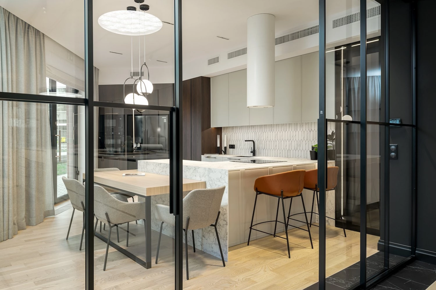 Metal doors feature slim, steel-framed panels